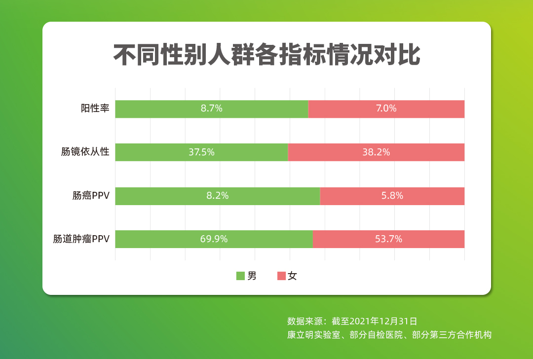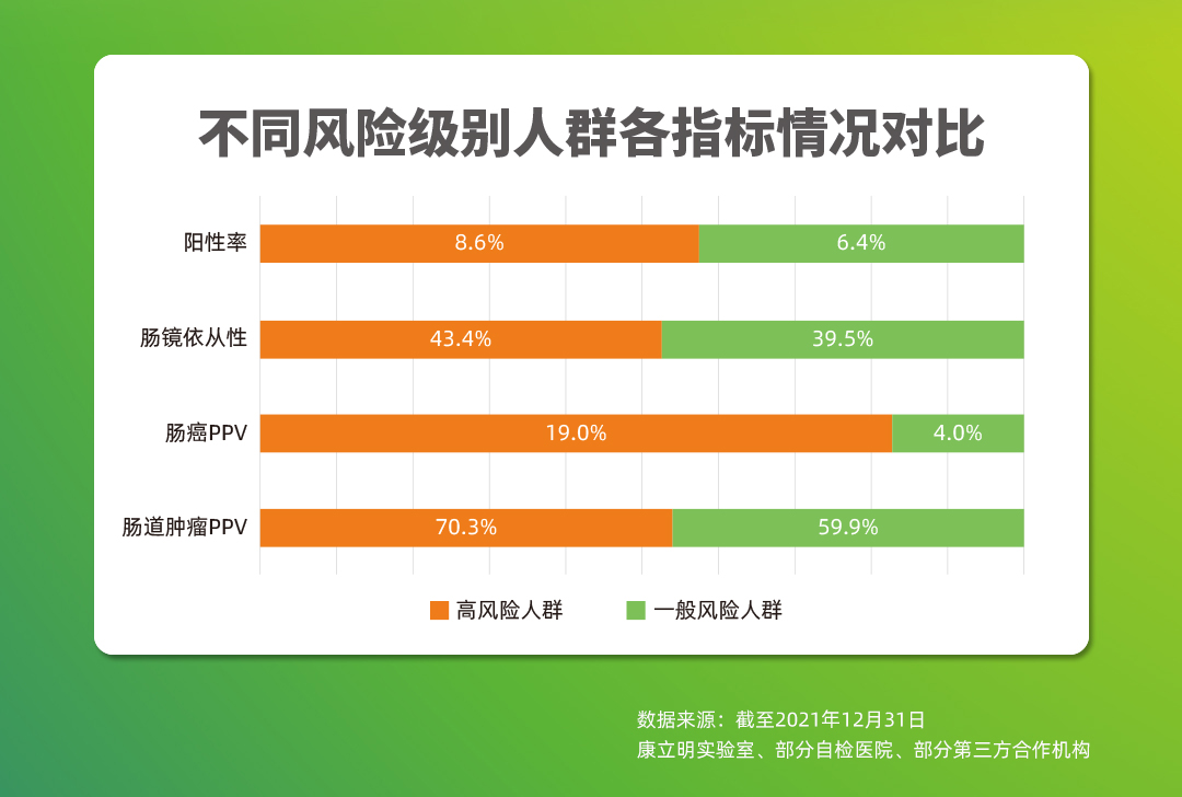 截至2021年12月,作為持續(xù)披露真實(shí)世界應(yīng)用數(shù)據(jù)的腸癌糞便基因檢測產(chǎn)品,長安心®共完成33萬例前瞻性應(yīng)用檢測,其中175528例應(yīng)用數(shù)據(jù)可追溯,12114例受檢者長安心®檢測結(jié)果陽性(陽性率6.9%),其中4970例長安心®檢測結(jié)果陽性的受檢者進(jìn)行了腸鏡復(fù)查(腸鏡依從性41.0%),一共發(fā)現(xiàn)3408例需要治療的受檢者,其中755例腸癌,1444例腺瘤,1209例息肉。長安心®對腸道腫瘤的預(yù)測值(PPV)為68.6%(其中腸癌的陽性預(yù)測值為15.2%),來自國家科技部項(xiàng)目的數(shù)據(jù)顯示,長安心®的陰性預(yù)測值更是高達(dá)99.9%。