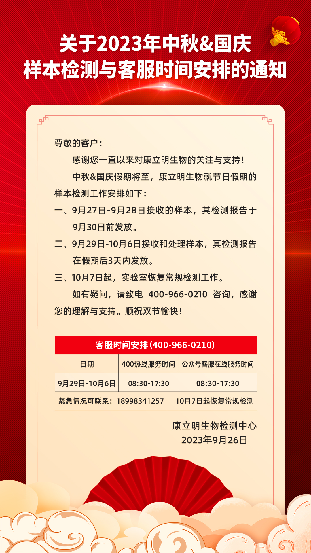 關(guān)于2023年中秋&國(guó)慶·樣本檢測(cè)與客服時(shí)間安排的通知