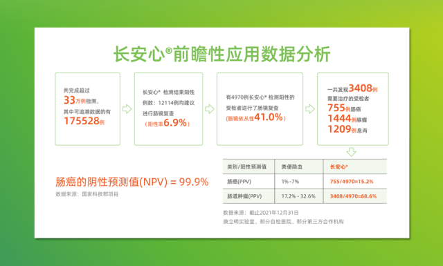 糞便DNA檢測(cè)技術(shù),正成為腸癌篩查中的重要一環(huán)??盗⒚魃锸紫袌?chǎng)官鄧曉琴發(fā)布的腸癌糞便基因檢測(cè)產(chǎn)品“長(zhǎng)安心”最新前瞻性應(yīng)用數(shù)據(jù)顯示,截至2021年12月,長(zhǎng)安心共完成33萬(wàn)例前瞻性篩查,其中175528例篩查數(shù)據(jù)可追溯,12114例受檢者檢測(cè)結(jié)果陽(yáng)性(陽(yáng)性率6.9%),其中4970例檢測(cè)結(jié)果陽(yáng)性的受檢者進(jìn)行了腸鏡復(fù)查(腸鏡依從性41.0%),一共發(fā)現(xiàn)3408例需要治療的受檢者,其中755例腸癌,1444例腺瘤,1209例息肉。“長(zhǎng)安心”對(duì)腸道腫瘤的陽(yáng)性預(yù)測(cè)值(PPV)為68.6%(其中腸癌的陽(yáng)性預(yù)測(cè)值為15.2%),來(lái)自國(guó)家科技部項(xiàng)目的數(shù)據(jù)顯示,長(zhǎng)安心的陰性預(yù)測(cè)值達(dá)99.9%。